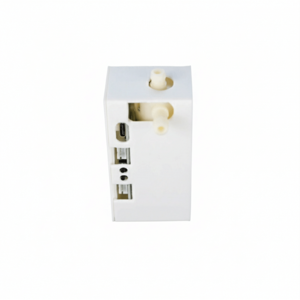 Thanks to its two fluid sensor ports, the PUMP-1 detects the presence of water and automatically stops pumping when the tank is empty or when watering is complete. Powered by 5 V via USB-C, it is easy to integrate into any Home Assistant-based home automation system.