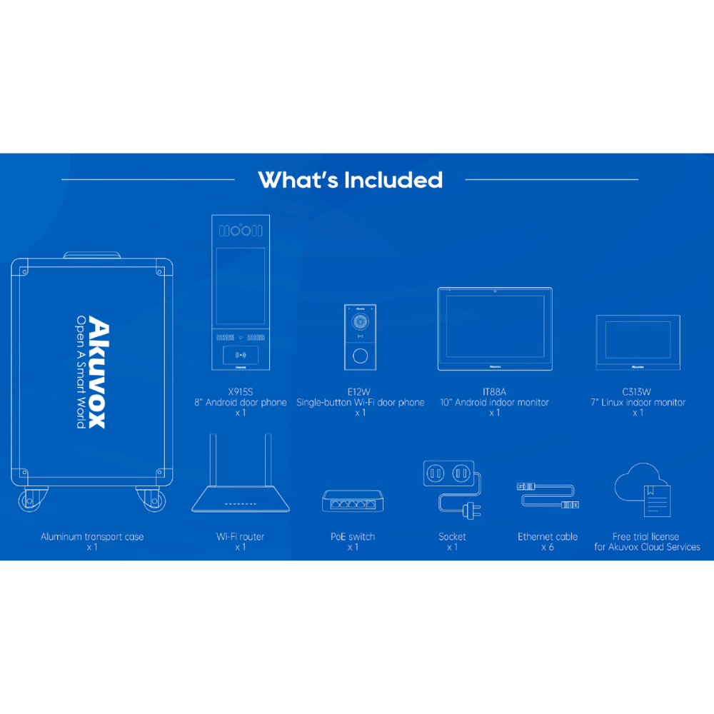The Akuvox Training Kit can be used to introduce Akuvox intelligent intercom products to customers or technicians. The Akuvox training kit consists of functional products, a trial cloud license and the necessary network hardware.