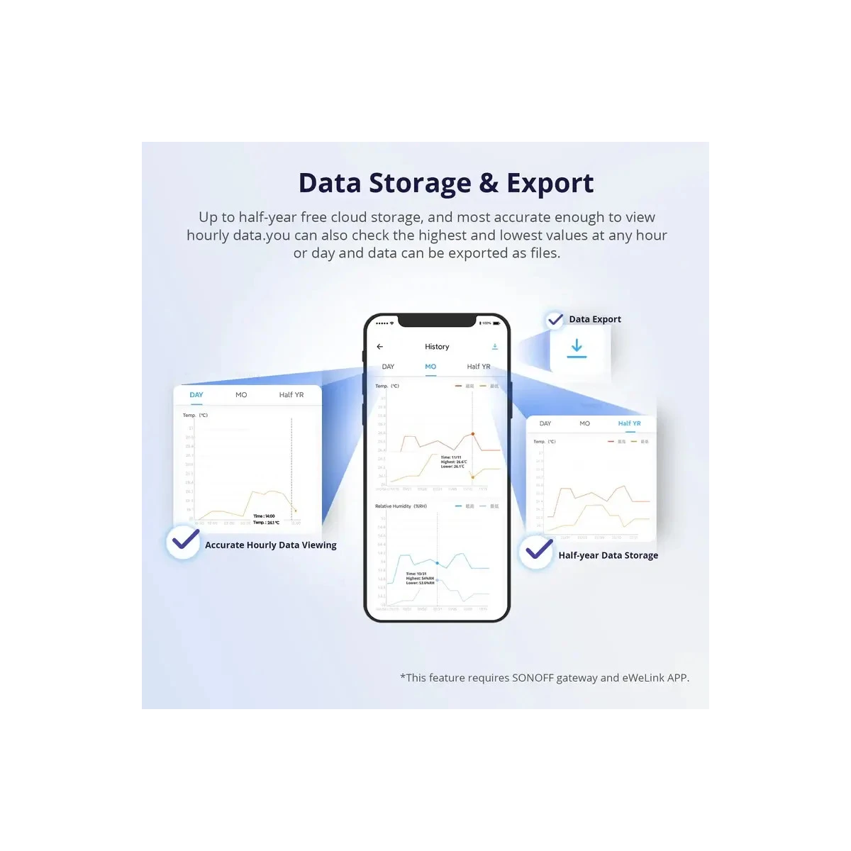 High-precision real-time climate monitoring The Sensirion SHT40 sensor, manufactured in Switzerland, delivers exceptionally precise measurements: ±0.2°C for temperature in the range of -10°C to +60°C, and ±2% relative humidity in the range of 0 to 99%. The automatic refresh every 5 seconds allows real-time monitoring of climate variations, essential for quickly reacting to changing conditions. Via the eWeLink app or your home automation platform, you can view detailed data history with semi-annual curve graphs, identify maximum and minimum values by hour or day, and export data as files for in-depth analysis. The free 6-month cloud storage retains your historical data with hourly accuracy to understand long-term trends.