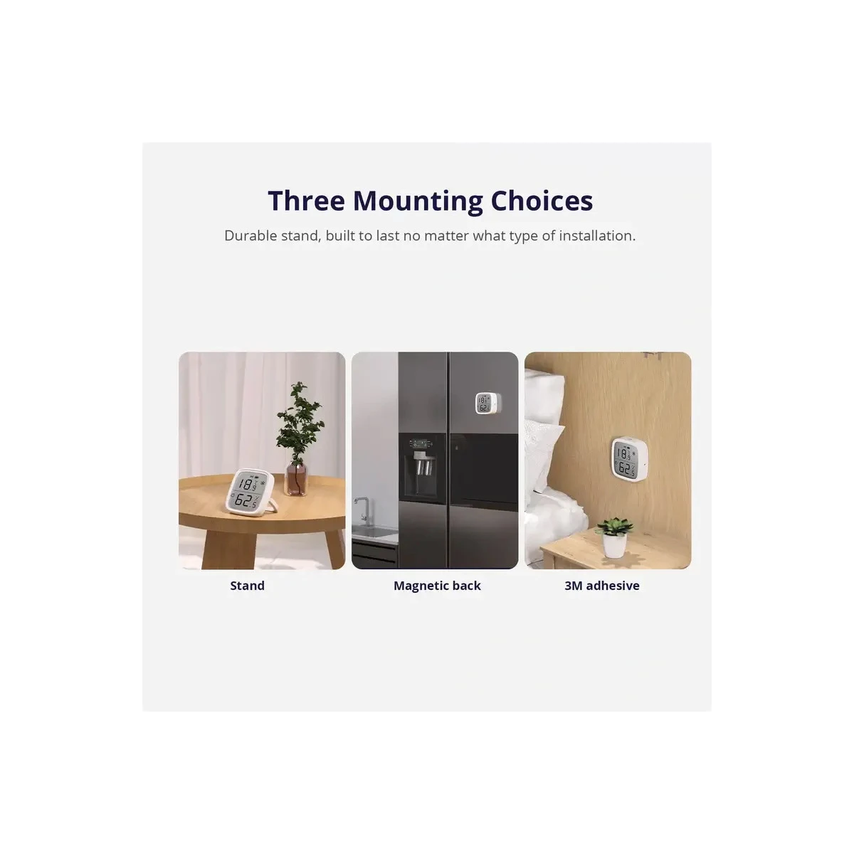 Robust design for indoor and outdoor The IP65 certification combined with a special breathable and waterproof membrane allows the SNZB-02WD to function perfectly in humid, foggy, or weather-exposed environments. Install it without fear near a window, in your garden, under a pergola, in a horticultural greenhouse, or on a balcony. Its UV resistance ensures the durability of the casing and screen even in direct sunlight. The sensor maintains its performance even in cold environments, making it versatile for all your climate monitoring needs. Its LCD screen remains perfectly readable in all lighting conditions for immediate local consultation without needing to take out your smartphone.