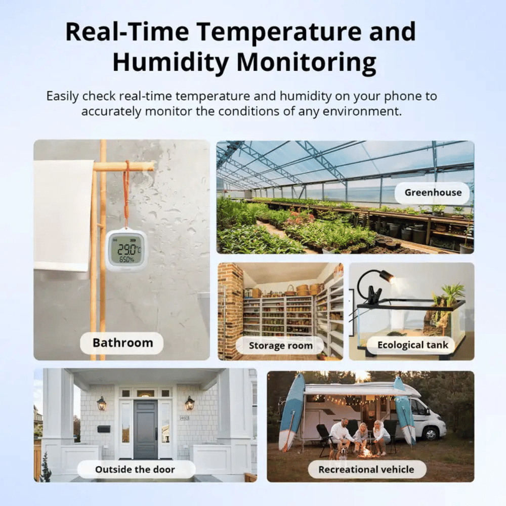 - Funzioni domotiche disponibili tramite l'applicazione: cronologia dei dati, esportazione/importazione delle misure, creazione di funzioni automatiche o avvisi in caso di variazioni improvvise di temperatura o umidità.
